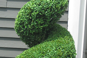 Boxwoods are the most commonly used shrubs for topiaries because of their fine texture and ability to tolerate shearing to any form imaginable. We typically shear them twice per year to maintain their form, tweaking them a little with each trimming.